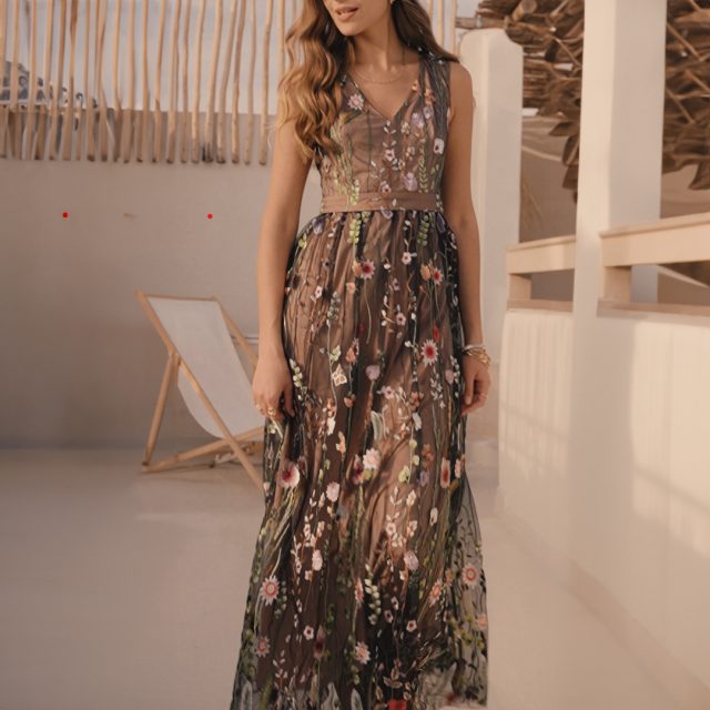 Romantisches, langes Kleid aus floralem Tüll... - tiefer V-Ausschnitt -...