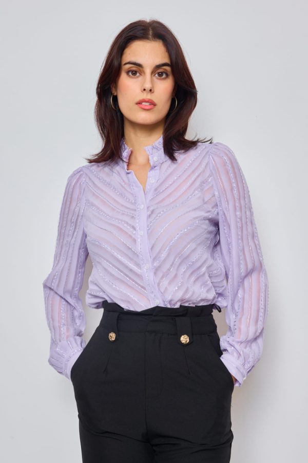 Beschreibung: Langarmbluse mit Rüschenkragen, Ton-in-Ton-Streifen, besticktes Strukturmaterial, transparent