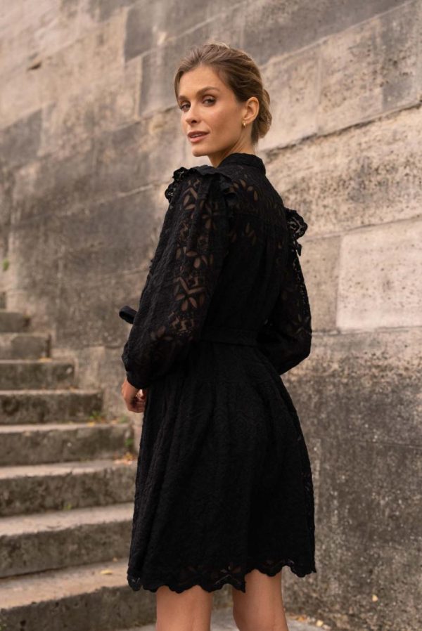 Spitzenkleid mit Stehkragen – Rüschendetails vorne – Knopfleiste vorne – lange Ärmel – geraffte Details an den Ärmeln
